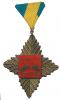 Detroit (Detroitia) - Domácí řád, litý kříž smrk.větví 90x74 mm ve středu červený smaltovaný čtverec 20,1x30,5 mm, souboj dvou schlaraf.rytířů v autech, nápis DETROITIA a IN ARTE VOLUPTAS _ouško se stuhou