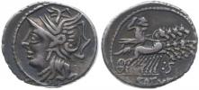 AR Denár, Hlava Romy / Victoria v quadrize zprava nápis "AP.CL.T.MANL.Q.VR.", Cr.299/1a, S.176, Al.1090, Ves.1098