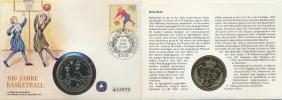 5 Dollars 1991 - 100. výr. basketbalu KM 144 adjustace j ako dopis, v barevné obálce se známkou 140+60 pf. a příležitostn ím razítkem z 14. 3. 1991 pošta Bonn 1 obálka čílo *12673 mince Proof