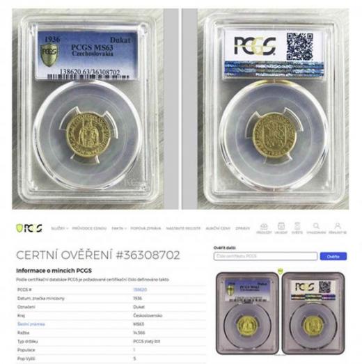 Svatováclavský Dukát 1936 R v certifikaci PCGS MS 63.  Au 986 (dukátové zlato 23,7 karátů) - 3,49 g - mincovna Kremnica - poslední dostupný ročník - náklad pouze 14 500 kusů !! - certifikace PCGS = záruka pravosti a jakosti - pouze 5 mincí má v této certifikaci vyšší hodnocení. Poštovné po platbě předem 160 Kč, dobírka 230 Kč. Poštovné za dobírku požaduji předem. Možnost osobního převzetí a platby v Bílovci.