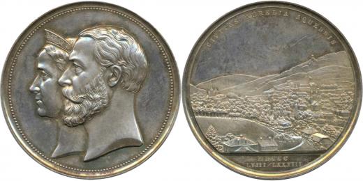 Baden, Fridrich I. 1852-1907, manželský pár zleva/pohled na město Baden-Baden, 25.výr.1858-1883, Ag med. 50mm, 51,7g, Zeitz.342 R n.hr.sbírkový