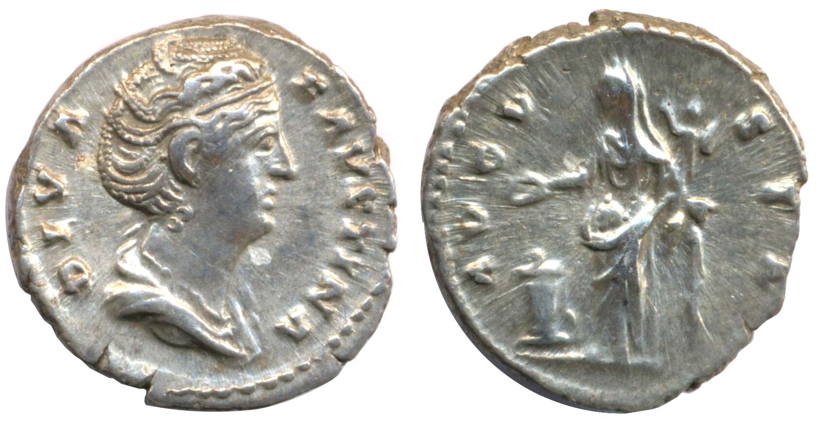 Faustina I., 141, denár, R: Vesta, RIC.368, BMC.42