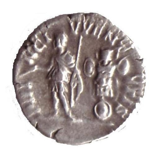 AR denár. L: poprsí vpravo, P SEPT GETA CAES PONT. R: stojící císař s kopím, vpravo trofeje, PRINCI IVVENTVTIS. 3,46 g. S 7196, RIC 18 napr. střížek