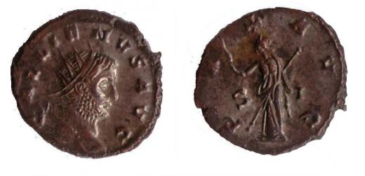 Billon. antoninian. L: hlava s paprskovou korunou zprava, GALLIENVS AVG, R: stojící Pax vlevo, drží žezlo a olivovou snítku, PAX AVG, SI, minc. Siscia, 3,24 g. mírně excentrický