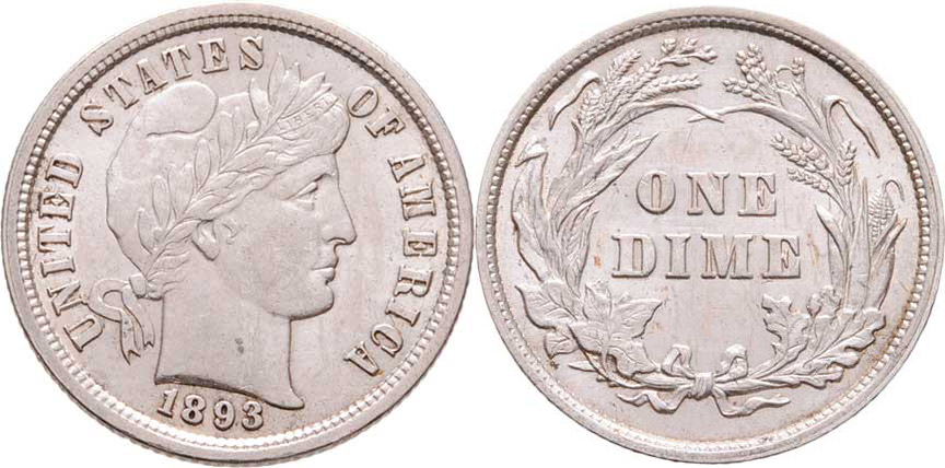 Dime (10 Cent) 1893 - Barber, KM.113 (Ag900), 2.503g, nep.hr., nep.rysky, pěkná patina, téměř