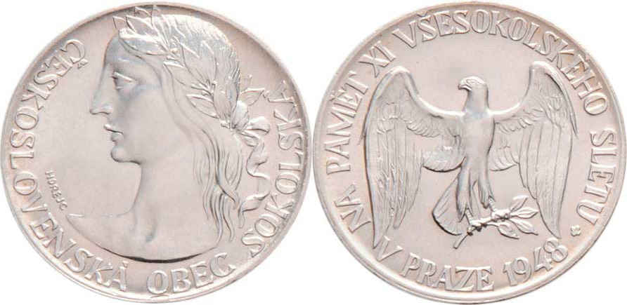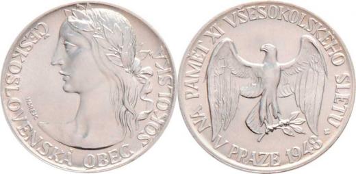 ČOS - na paměť XI. všesokolského sletu v Praze 1948 - poprsí ženy zleva, opis / sokol s rozepjatými křídly, opis, Sign., Punc., Ag500, 28mm, 13.962g