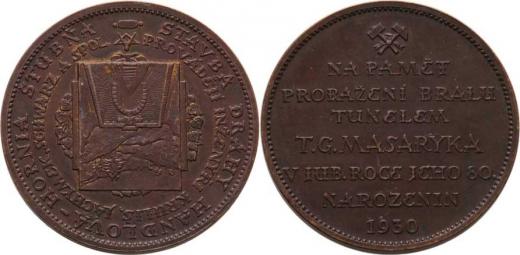 Hám - dráha Handlová-Hor.Štubňa - tunel TGM 1930 - portál tunelu v krajině, dvojitý opis / 7-řádk.nápis, hornická kladívka, Nesign., bronz 40mm, skvrnka, tém.