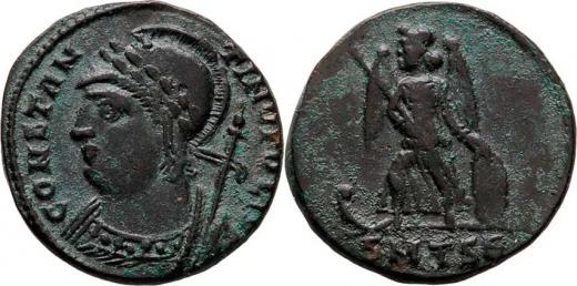 AE3, Rv: Victorie na přídi lodi, S.3790, RIC.7.188 - Thessalonica - 5.dílna - ražba z let 330 - 333, pat.