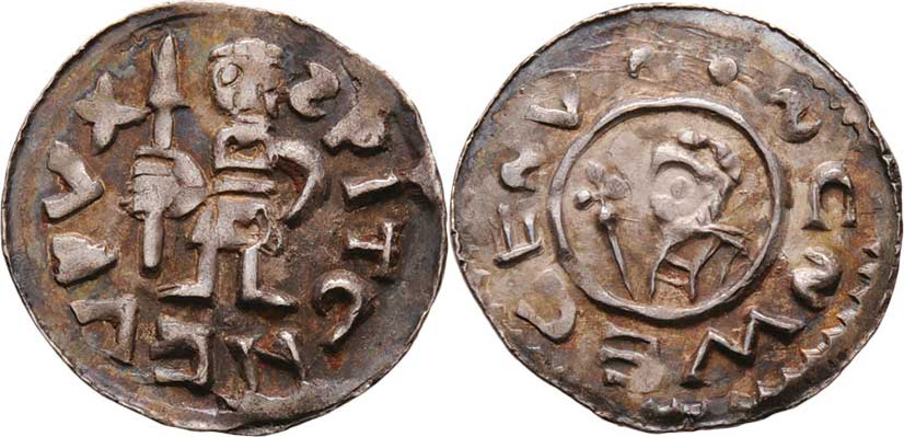 Denár, Ca.331, F.VIII/18 (824) - otočené S v aversu, ležatá S v reversu, 0.948g, nep.nedor., pěkná patina