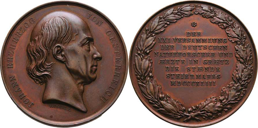 Cesar - XXI.setkání přírodov. a lékařů v Grazu 1843 - poprsí zprava, opis/ 8-řádk. nápis ve věnci, Sign., měď 50 mm, H.3590, dr.hr., krásná patina, téměř