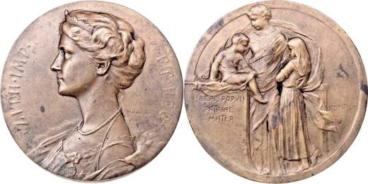 Kautsch - pamětní medaile b.l. (1916) - portrét zleva a opis / stojící císařovna se dvěma dětmi, nápis, Sign., patinovaný bronz 65 mm, skvrnky, téměř R!