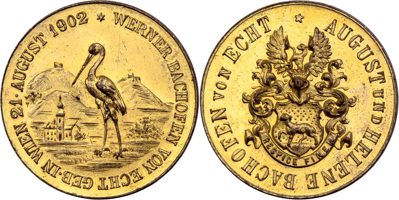 Nesign. - zlac.bronzový jeton na narození 21.8.1902 - čáp v krajině, opis/ rodový znak, opis, 24mm, 6.113g, pěkná patina, téměř