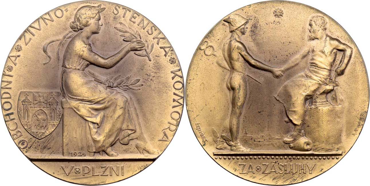 Obchodní a živnost.komora v Plzni - Za zásluhy 1924 - Merkur a Vulkán si podávají ruce, nápis / sedící žena se znakem Plzně, písmo, patinov. bronz 50 mm, etue