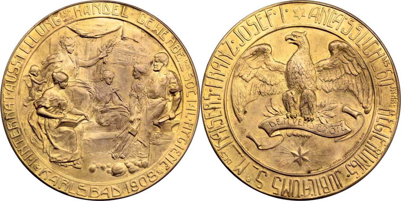 Mezinár. obchodní a živnost. výstava 1908 - alegorie, opis / letící orel nese ratolest a stuhu s nápisem, opis, Sign.Christlbauer, zl.bronz 60 mm, patina, tém.