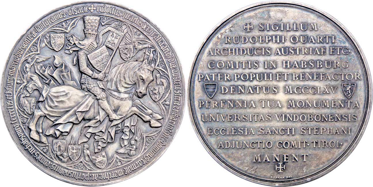 Bodlak - 600 let úmrtí Rudolfa IV. Habsburského 1965 - replika jezdecké pečeti / 11-řádkový nápis, dva znaky, Sign., patinované stříbro 62 mm, 56.753g