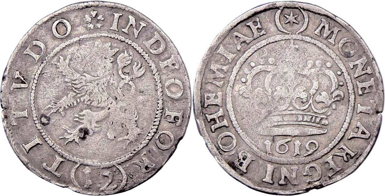 12 Krejcar 1619, K.Hora-Hölzl, J.4a, MKČ.578, 3.785g, dr.vady materiálu, nep.nedor., nep.dvojráz, pěkná patina R!