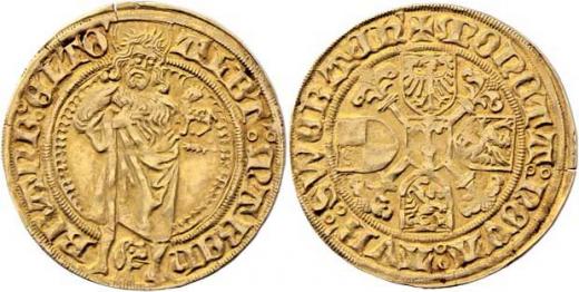 Goldgulden b.l., Schwalbach, stojící sv.Jan Křtitel, opis / velký kříž a čtyři znaky, opis, Fr.304, 3.264g, nep.zvlněný, nep.nedor., pěkná patina R!