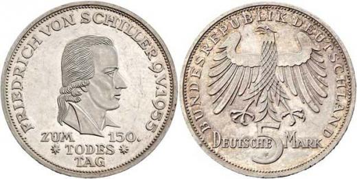 5 Marka 1955 F - Fr.Schiller, KM.114, 11.076g, nep.hr., nep.rysky, patina RR!