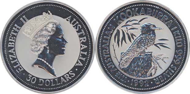30 Dolar 1992 - kookaburra - inverzní Proof - lesklý relief na matovém pozadí, 100mm, 1000g, KM.181 (raženo pouze 1000 ks), kapsle RR!