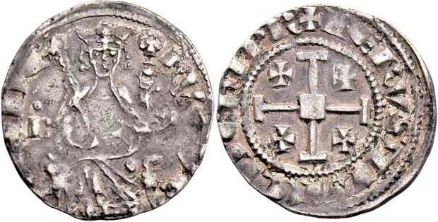 AR Grosso, Trůnící král zpředu, opis, zn."B", tečky / jeruzalémský kříž, opis, podobný jako MI.2440, podob. jako De Wit.III.4009, 4.540g, nedor., pěkná patina R!