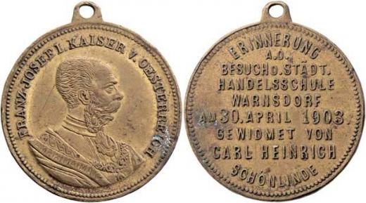 Warnsdorf - návštěva měst. obchodní školy 30.4.1903 - poprsí zprava, něm.opis / 9-řádk.něm.nápis, Nesign., mosaz 28 mm s pův.raž.ouškem, dr.hr., skvrnky, patina