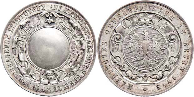 Moravské živnostenské muzeum 1873 - moravský znak v kartuši, něm.opis / něm.opis a kartuše pro udělení, Nesign., Ag 37mm, 24.252g, nep.hr., nep.rysky, téměř