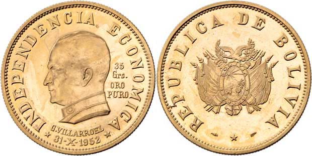 50 Bolivianos 1952 - generál Villarroel, KM.Pn58, (dříve KM.MB4), 38.943g, nep.rysky, skvrnky, tém. RR!