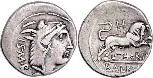AR Denár, Hlava Juno Sospity, náp."I.S.M.R." / býk ve skoku, náp. "T.L.THORIVS.BALBVS.", nahoře zn."H", Crawford.316/1, Seaby.Thoria.1, Alb.1117, exc., pat.