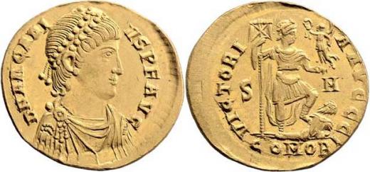 Solidus, Rv:"VICTORIA.AVGGG.", císař stojící nad zajatcem, S.4120, RIC.15b - Sirmium - 10.dílna - ražba z let 393 - 395, 4.261g, nep.exc., téměř R!