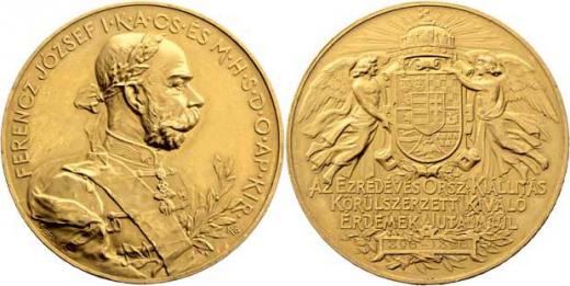 8-dukátová medaile 1896 - na maďarské milenium - poprsí zprava, ratolest, opis / znak nesený anděly, nápis, Sign.Gerlik, 38mm, 27.817g, nep.rysky RR!