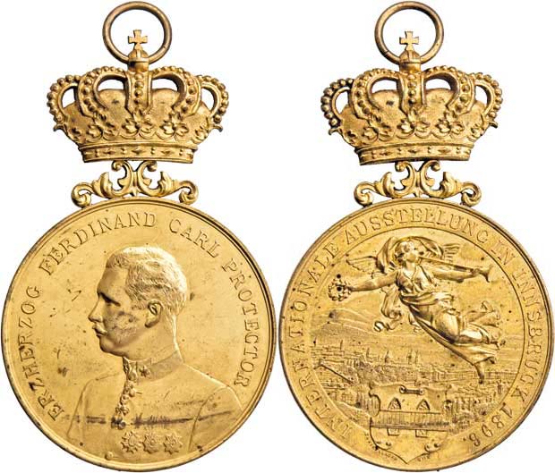 Mezinárodní výstava v Innsbrucku 1896 - poprsí zleva, opis / Fama letící nad městem, znak a opis, Sign. Christlbauer, zlac.bronz 51 mm převýš.korunou, skvrny