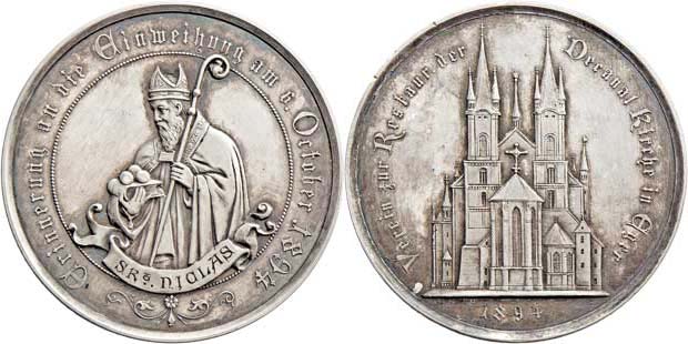 Balmberger - svěcení obnov.kostela sv. Mikuláše 1894 - světec, nápis na stuze a něm.opis/ chrám, něm.opis, Přib.75, Ag 50mm, 53.921g, vlas.rysky, patina