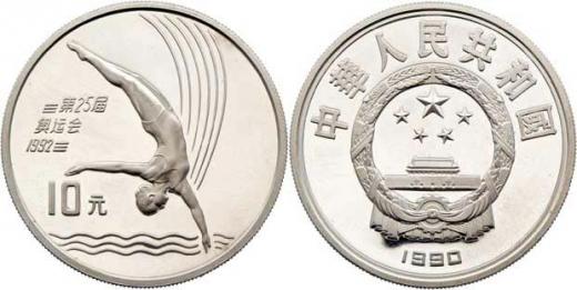 10 Yuan 1990 Ag - LOH Barcelona 1992 - skoky do vody, Y.336 (raženo pouze 30.000 ks), kapsle