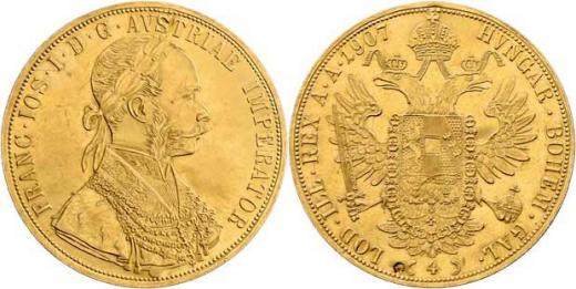 4 Dukát 1907 - kontramarka "koruna A1", 13.886g, nepatrná stopa po oušku, nep.rysky, patina