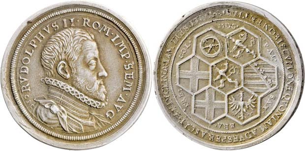 V.Maler - AR dutá medaile na říšský sněm 1599 - poprsí zprava, opis/ plástev se znaky sedmi kurfiřtů, opis, Ag 32mm, 10.009g, H.1211, Don.1402, patina R!