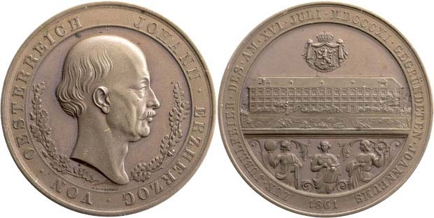 Radnitzky - AE medaile - 50 let Johannea v Grazu 1861 - hlava zprava, dubový věnec, opis / znak, budova, tři postavy a opis, Sign., 51mm, 67.851g, Haus.1600