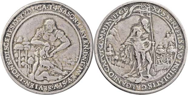 Samson bojuje se lvem, opis / zmrtvýchvstání Krista, v pravém poli Adam, Eva a had, opis, Nesign., patrně ražené Ag, 42mm, 23.747g, Don.4408, rysky, patina RR!
