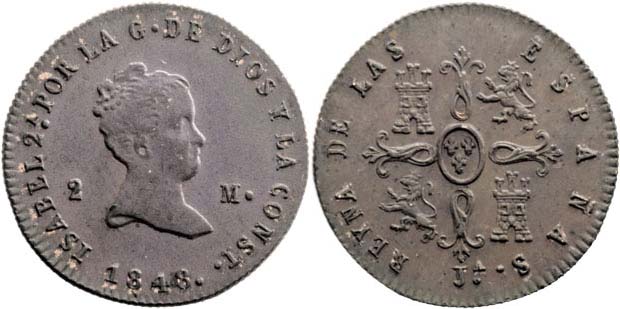2 Maravedies 1848 JA, Jubia, KM.532.2, 3.005g, krásná patina