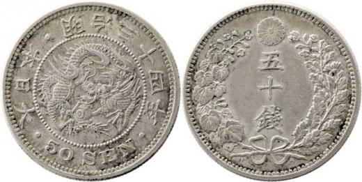 50 Sen, rok 34 (= 1901), Y.25, 13.469g, nep.hr., nep.rysky, pěkná patina, téměř