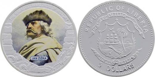 5 Dolar 2009 - největší válečníci - Jan Žižka, KM.0 (Ag999, 26.034g, 38mm, barevný tisk v rev.), kapsle