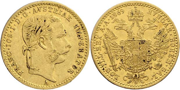 Dukát 1869 A, 3.490g, dr.hr., dr.rysky, patina