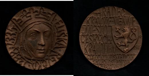 Vitanovský - Eliška Rejčka - 650 let úmrtí 1985 - hlava se závojem a královskou korunou, vročení, opis / znak a nápis, Sign., patinovaný bronz 50 mm, BK.8A