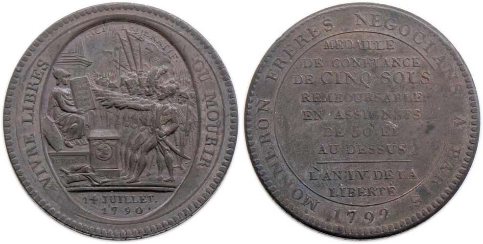 5 Sols 1792 - IV.rok revoluce - medailová ražba - bankovní poukázka (token), KM.Tn31, krásná patina, téměř
