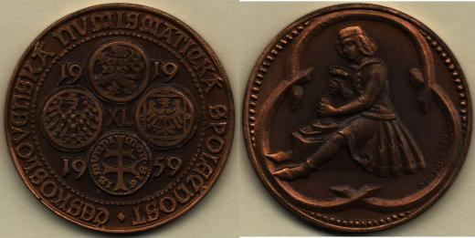 Špánek - 40 let Numismat. společnosti 1959 - sedící pregéř v gotické kružbě / drobné mince, vročení, opis, Sign., patinovaný bronz 31 mm, BK.5 (300ks)