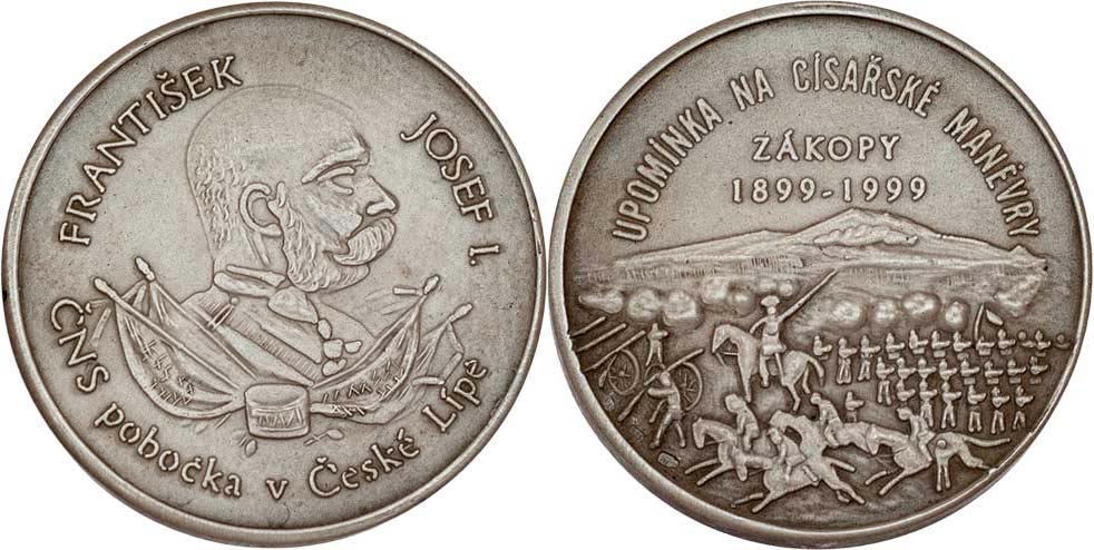 Lahoda - upomínka na manévry v Zákupech 1899/1999 - Fr.Josef I. zprava, vojenské atributy, opis / vojsko v krajině, nápis, Ag925, 30mm, 27.414g, 25ks RR!