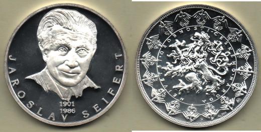Největší osobnosti českého národa - Jaroslav Seifert b.l. - poprsí čelně, vročení, opis / český lev, opis, kruh orlic, Sign., Ag999, 40mm, 29.003g