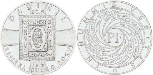 PF 2015 - 700.výročí úmrtí kronikáře Dalimila - kříž, kniha a opis / v paprscích jména vydavatelů, velké "PF" a opis, Sign., Ag925, 30mm, 14.211g