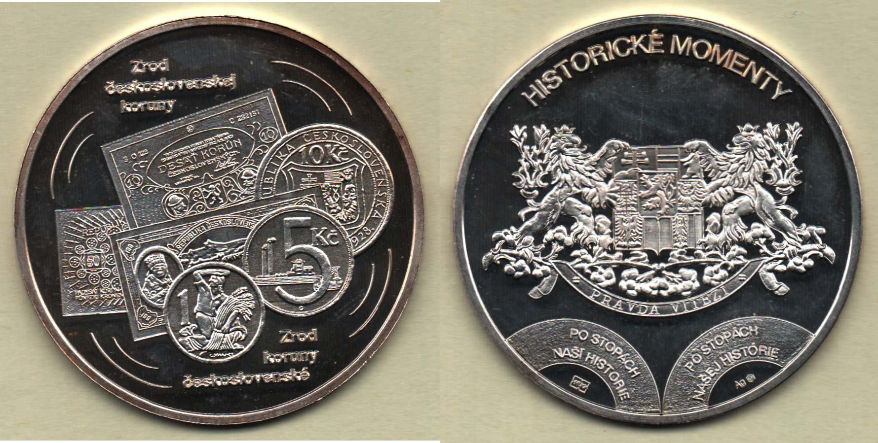 Historické momenty (cca 2010) - vznik Čsl.měny 1919 - státovky, mince a 6-řádkový nápis / státní znak, nápisy, Ag 35mm, 10.435g, nep.rysky, patina