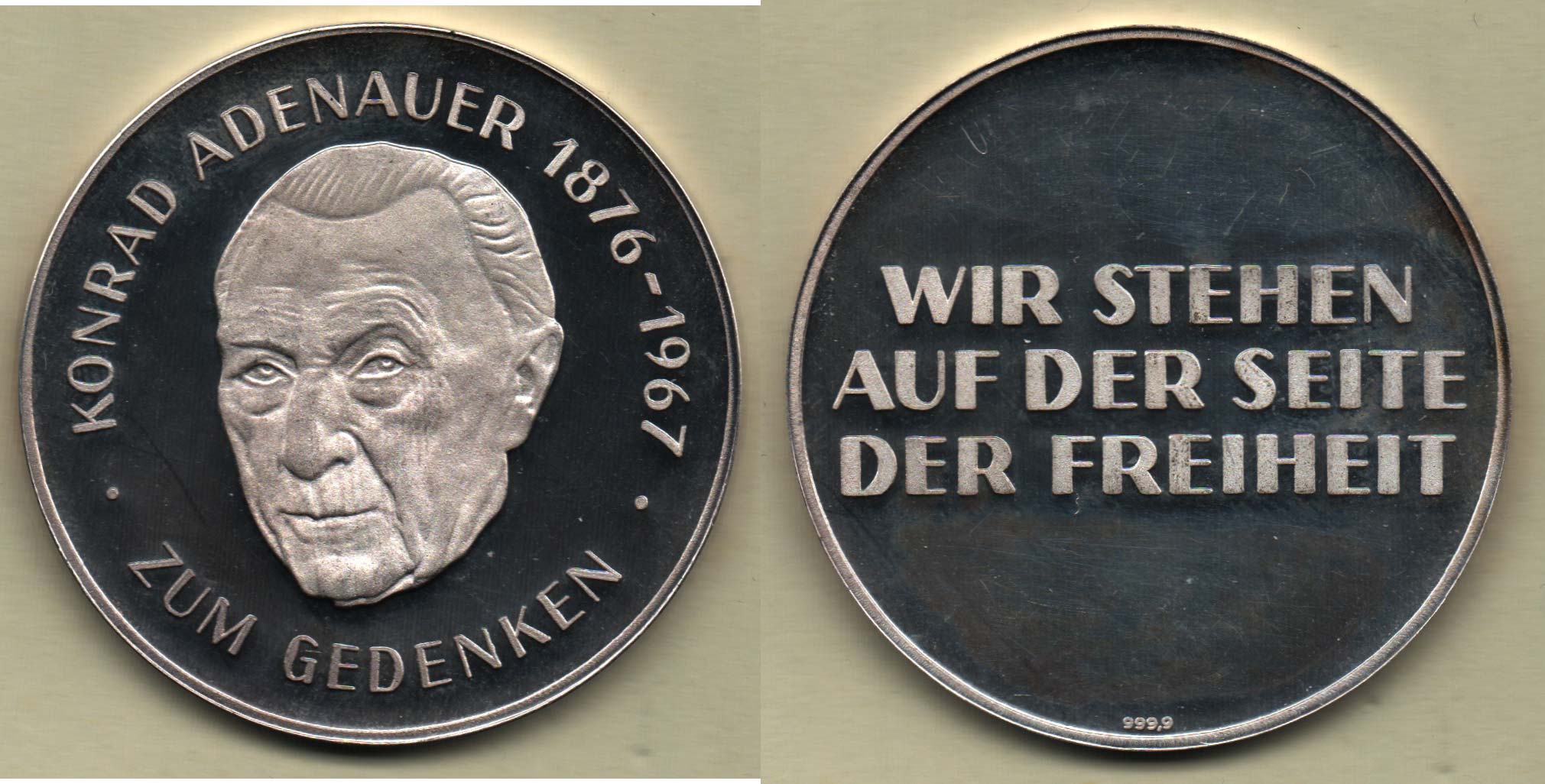 Konrád Adenauer - úmrtní medaile 1967 - hlava mírně zleva, opis / 3-řádkový nápis, Nesign., Ag999, 40mm, 26.039g, nep.rysky