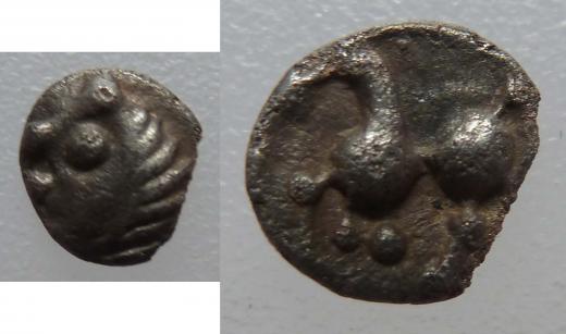 AR mince stradonického typu, Paulsen.27/655-657, Lanz.98-podobný, koník zleva, pod ním tečka / hlava zleva, 7mm, 0.468g, patina